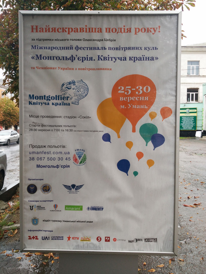 28 сентября 2018 года в Умани стартовал международный фестиваль воздушных шаров «Монгольфьерия. Цветущая страна» и был установлен рекорд Украины на высоте 4038 метров.