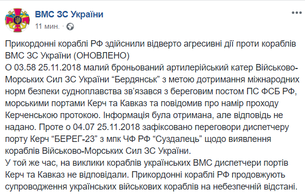 По состоянию на 13.40 ВМС Украины сообщают, что катер "Бердянск" ночью 25 ноября связывался с береговым постом Пограничной службы ФСБ РФ, морскими портами Керчь и Кавказ и сообщал о намерении прохода Керченским проливом, однако ответа не получил. После этого были зафиксированы переговоры диспетчеру порта Керчь "Берег-23" с мпк ЧФ РФ "Суздалец" по выявлению кораблей Военно-Морских Сил ВС Украины. В то же время, на вызовы кораблей украинских ВМС диспетчеры портов Керчь и Кавказ не отвечали.