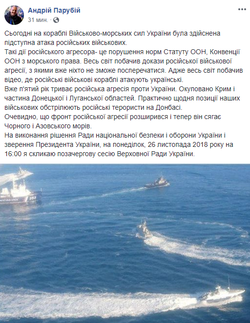 "Весь мир увидел доказательства российской военной агрессии, с которыми уже никто не сможет поспорить. Ведь весь мир увидел видео, где российские военные корабли атакуют украинские", - заявил спикер парламента.
