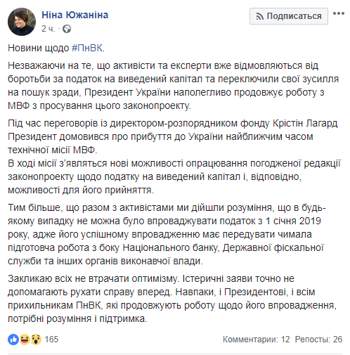 Южанина отметила, что Порошенко настойчиво продолжает работу с МВФ по продвижению законопроекта о налоге на выведенный капитал. Миссия МВФ приедет по его приглашению, а в ходе ее работы появятся новые возможности обработки согласованной редакции законопроекта и, соответственно, возможности для его принятия.