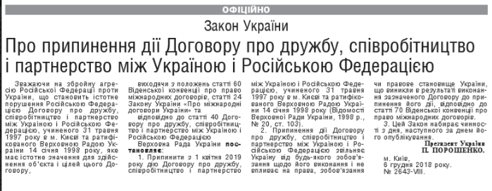 Вчера, 10 декабря президент Петр Порошенко подписал закон № 0206 о прекращении действия договора о дружбе.