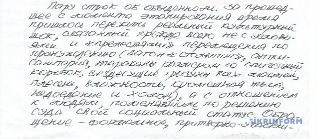 "Пару строк об обыденном. За прошедшее с момента этапирования время пришлось пережить культурный шок, связанный прежде всего не с условиями и "прелестями" перемещения по принуждению (вагон "столыпин", антисанитария, тараканы размером со спичечный коробок, вездесущие грызуны всех мастей, плесень, влажность, кромешная тьма, недоедание и холод), а с отношением к людям, поменявшим по решению суда свой социальный статус", - пишет Сущенко.