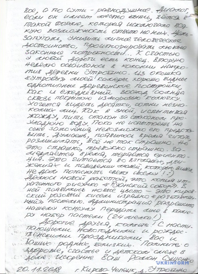 Незаконно осужденный в РФ украинский журналист Роман Сущенко прислал свой первый рисунок из колонии строгого режима в Кировской области в деревне Утробино и рассказал о своих наблюдениях о новом месте пребывания.