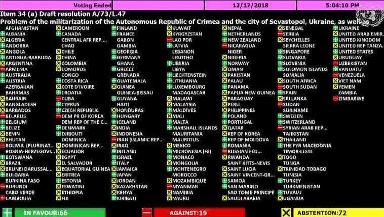 Представительство Украины в ООН сообщило, какие 19 стран не поддержали резолюцию Проблема милитаризации АР Крым и г. Севастополь (Украина), а также районов Черного и Азовского морей на заседании Генассамблеи ООН в понедельник, 17 декабря.