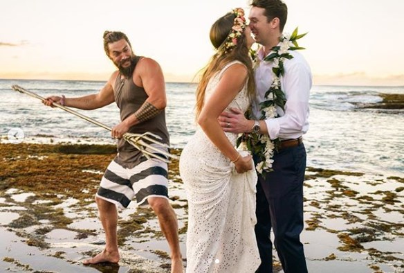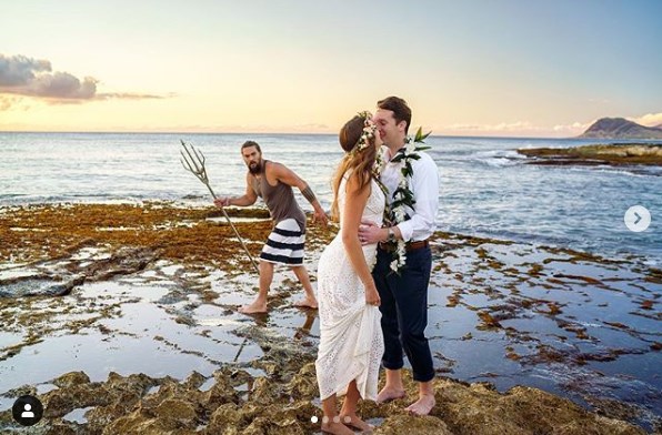 Теперь на нескольких свадебных фотографиях влюбленных красуется Джейсон Момоа с трезубцем Аквамена.
