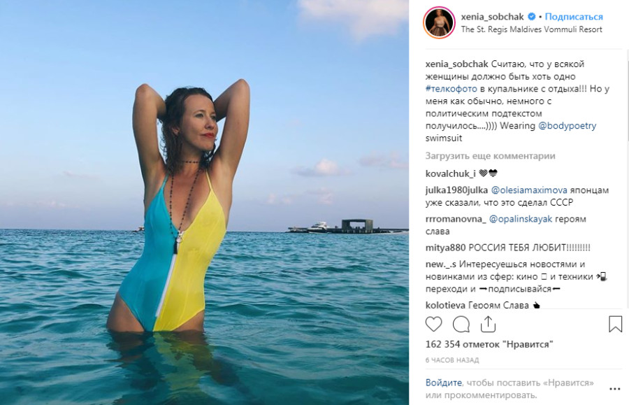 Популярная российская телеведущая и политик Ксения Собчак шокировала очередной раз публику, опубликовав фото в "политическом" купальнике.