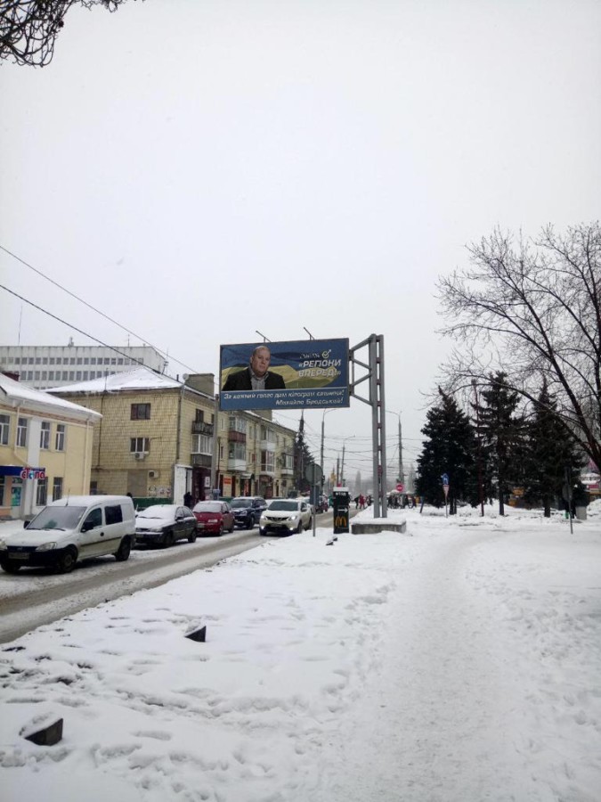 Так, у місті Суми з’явилися борди з рекламою, на якій зображений Бродський зі слоганом «За кожний голос дам кілограм свинини».