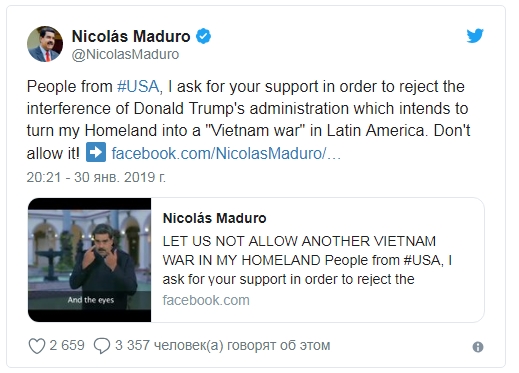 "Я прошу вашей поддержки, чтобы отразить вмешательство администрации Дональда Трампа, которая пытается сделать из моей родины Вьетнам в Латинской Америке. Не допустите этого!", − подчеркнул глава государства.