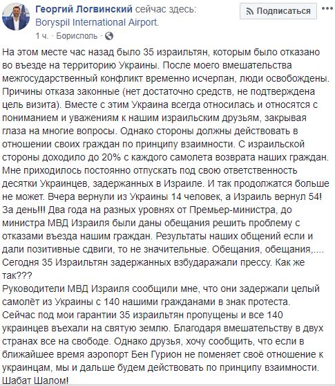 В израильском аэропорту Бен Гурион задержан целый самолет из Украины. Это было сделано в знак протеста против отказа во въезде гражданам Израиля. Об этом сообщил в Facebook адвокат и нардеп Георгий Логвинский.