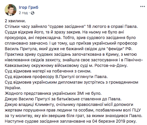 "Суд отказал матери на свидание с сыном. Суд отказал профессору Василию Притуле осмотреть Павла. Суд отказал украинским дипломатам встретиться с гражданином Украины. Ни одного представителя украинских СМИ не было", - отметил Гриб.