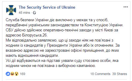 "Ответственно заявляем, что проводимые мероприятия не связаны ни с одним из кандидатов в президенты Украины или их окружением. По указанному адресу не зарегистрированы офисные помещения, к которым имеют отношение кандидаты", - подчеркнули в СБУ.