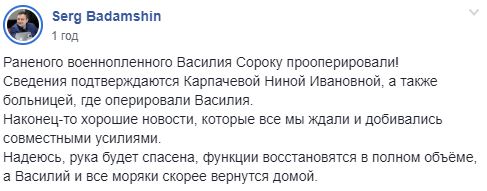 "Раненого военнопленного Василия Сороку прооперировали! Наконец хорошие новости, которые все мы ждали и добивались совместными усилиями. Надеюсь, рука будет спасена, функции восстановятся в полном объеме, а Василий и все моряки быстрее вернутся домой", - отметил Бадамшин.