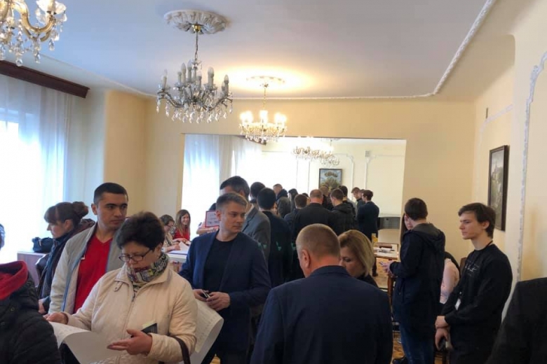 Украинцы, голосующие на избирательном участке при посольстве Украины в Варшаве, с самого утра выстроились в очередь.