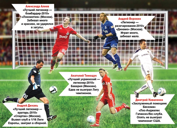 Конечно же, самым главным и успешным украинским легионером следует считать Анатолия Тимощука. Он единственный из наших игроков выступает в топ-чемпионате, и в нынешнем году в его активе германский хет-трик, то есть победы в чемпионате, Кубке и Суперкубке Германии, а также участие в финале Лиги чемпионов. Самое интересное, что начинал год Анатолий в железном запасе. Голландский тренер мюнхенцев Луи Ван Галь довольно скептически относится к футбольным талантам Тимощука — он всегда отмечал трудолюбие украинца, но не верил в его техническую оснащенность. И недопонимание между тренером и игроком продолжается. Несмотря на это, Ван Галь вынужден был в связи с травмами и неудачными выступлениями других игроков доверить место на поле Тимощуку. После первого круга Бундеслиги сезона 2010/2011 авторитетнейший немецкий журнал Kicker включил нашего хавбека в символическую сборную чемпионата. Место в ней Анатолию нашлось не на привычном месте опорника, а в центре защиты, где он нынче играет. Настойчивость Тимо не смогла сделать его более техничным футболистом или поднять на качественно новый уровень игры, однако трудолюбие, терпение и легкий характер принесли ему любовь болельщиков. В нынешнем сезоне Тимощук даже стал забивать соперникам «Баварии». Вообще год для него был крайне насыщенным: от мюнхенских неурядиц и успехов до «отцовского дубля» — в конце апреля супруга Надя подарила ему дочурок-близняшек. Малышки появились на свет лишь шестимесячными, однако немецкие врачи смогли справиться с нелегкой ситуацией. Так что после череды проблем все у Тимощука в Мюнхене налаживается.
