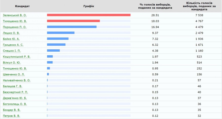 После подсчета бюллетеней, поданным ЦИК, лидирует кандидат Владимир Зеленский (28,51%), на втором месте - Юлия Тимошенко (18,03%), на третьем - действующий президент Украины Петр Порошенко (16,94%).