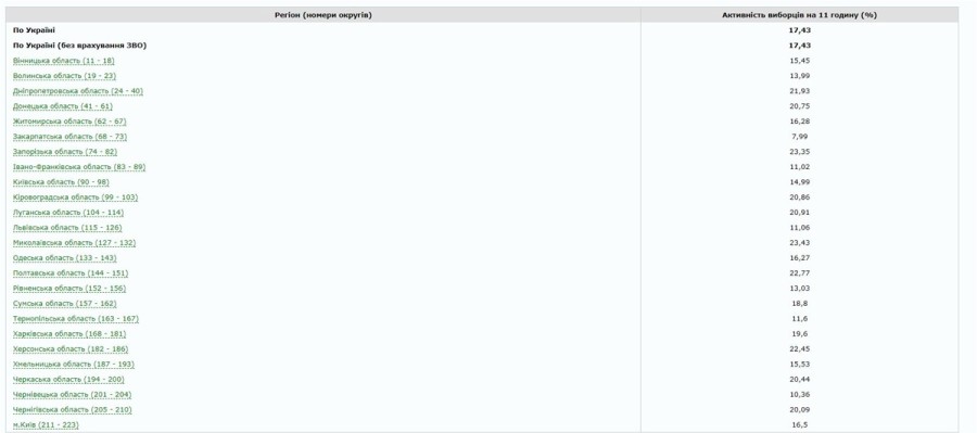 Наибольшая активность избирателей наблюдается пока в Запорожской (23,35%), Херсонской (22,45%) и Полтавской областях (22,77%). Самая Низка я вка пока в Закарпатской (7,99%), Ивано-Франковской (11,02%) и Львовской областях (11,06%). Явка в Киеве на 11 утра составила 16,5%.