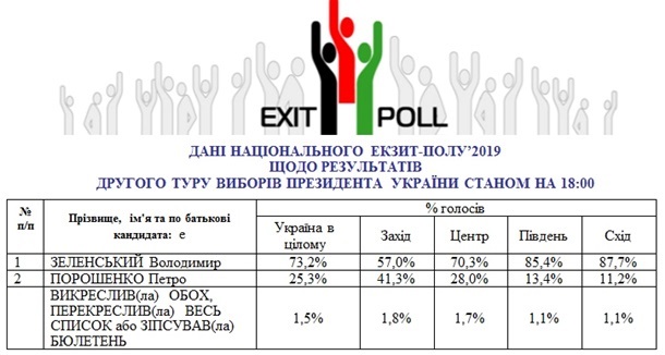 По данным всеукраинского экзит-полла, проведенного по заказу программы ТСН на телеканале 1+1, Зеленский набирает 72,7 процента, Порошенко - 27,3 процента.