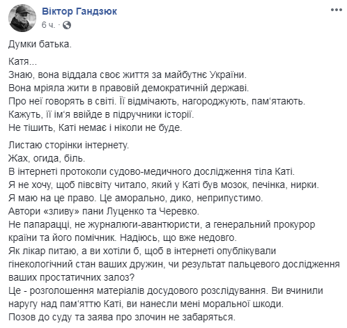 "В интернете протоколы судебно-медицинского исследования тела Кати. Я не хочу, чтобы полмира читало, какой у Кати был мозг, печень, почки. Я имею на это право. Это аморально, дико, недопустимо", - отметил Гандзюк.