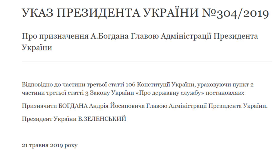 "Согласно части третьей статьи 106 Конституции Украины, учитывая пункт 2 части третьей статьи 3 Закона Украины "О государственной службе" постановляю: назначить Богдана Андрея Иосифовича главой Администрации президента Украины", - сказано в документе.