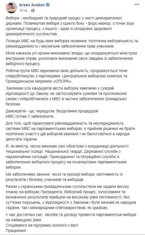 "Для того, чтобы гарантировать равноудаленность и беспристрастность системы МВД на парламентских выборах, я принял решение не принимать политического участия в этой избирательной кампании и не баллотироваться в народные депутаты Украины", - написал глава МВД Украины на странице в Facebook.