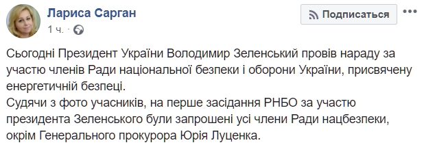 "Судя по фото участников, на первое заседание СНБО при участии президента Зеленского были приглашены все члены Совета нацбезопасности, кроме генерального прокурора Юрия Луценко. Специально проверила по списку: не исключен", - написала Сарган.