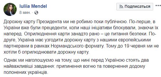 "Дорожную карту президента мы не делаем пока публичной. Во-первых, в Украине уже были прецеденты, когда наши инициативы блокировали, зная их заранее. Обнародование карты слишком рано – это вопрос безопасности. Во-вторых, Украина должна согласовать дорожную карту с нашими европейскими партнерами в рамках "нормандского формата". Поэтому до 19 июня мы не хотели бы обнародовать дорожную карту", – заявила Мендель.