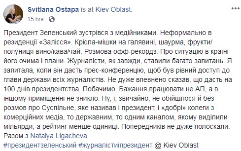 "Президент Зеленский встретился с медийщиками. Неформально в резиденции Залесье. Кресла-мешки на поляне, шаурма, фрукты/клубника/вино/кофе/чай. Разговор офф-рекордз. О ситуации в стране его глазами и планах. Журналисты, как всегда, задавали много вопросов. Я спросила, когда он даст пресс-конференцию, чтобы был равный доступ к Главе государства всех журналистов. Не очень уверенно сказал, что даст на 100 дней президентства. Посмотрим", - говорится в сообщении.