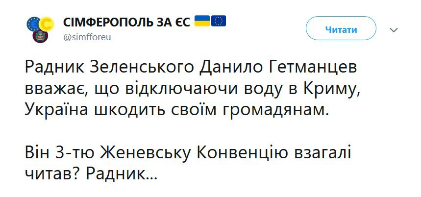 Пользователи сети бурно отреагировали на слова советника президента Владимира Зеленского Даниила Гетманцева о вреде гражданам Украины из-за отключения водоснабжения в оккупированном РФ Крыму.