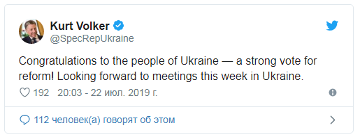 "Поздравления народу Украины – сильный голос за реформы! Ждем встреч на этой неделе в Украине", – написал Волкер на своей странице в Twitter.