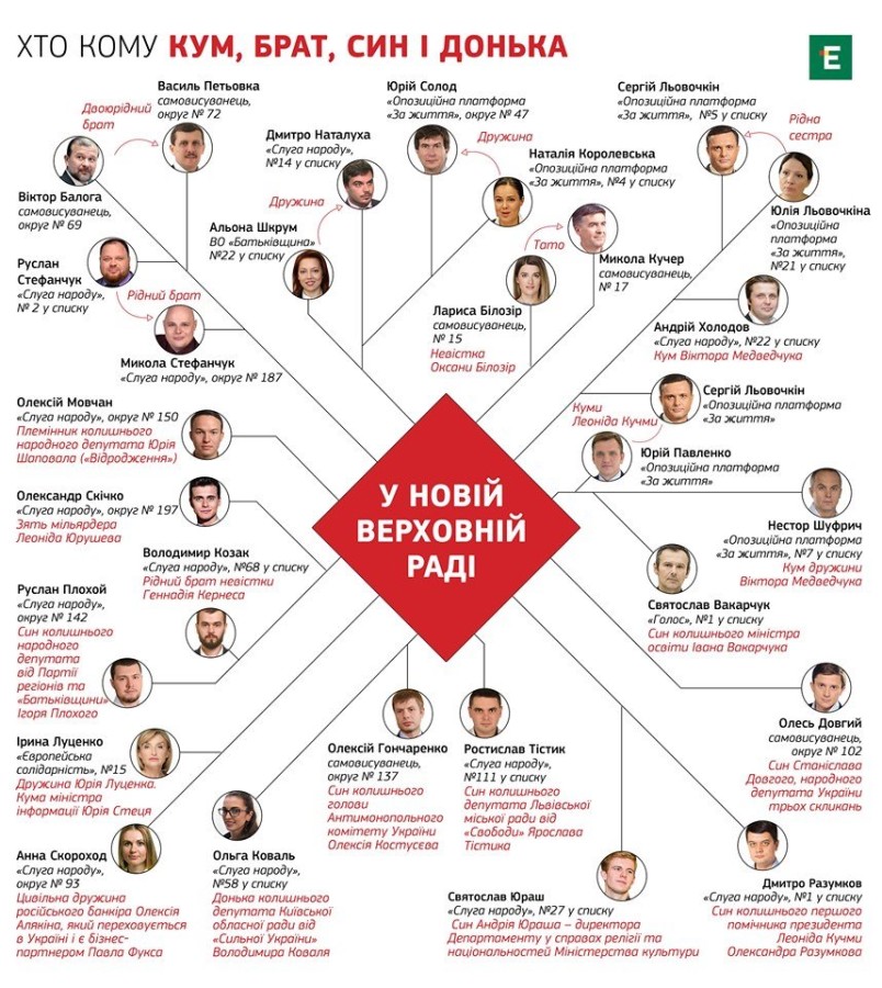 Как оказалось, далеко не все "новые лица" в Верховной Раде действительно новые. Так или иначе, в парламенте в очередной раз собран полный букет родственников, сыновей, кумовей и других, как принято говорить в клуарах ВРУ, "правильных людей". СМИ даже составили подроьную графику, по котлорой можно наглядно увидеть родственные и прочие связи новоизбранных наредпов.