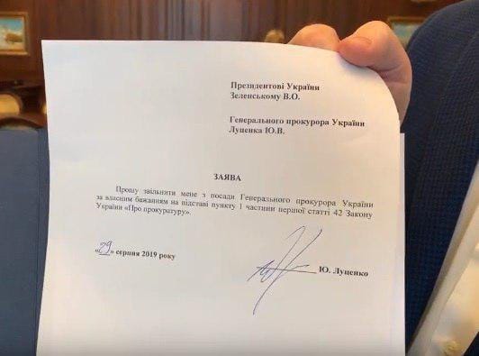 "Юрий Луценко подписал заявление на имя президента Зеленского об увольнении с должности генерального прокурора", - написала Сарган.