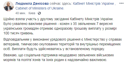 "Было утверждено важное решение - каждый из 35 освобожденных 7 сентября украинских граждан получит одноразовую денежную выплату в размере 100 тысяч гривен", - написала Денисова на своей странице в Facebook.