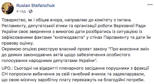 "Как и обещал вчера, направляю в комитет по вопросам регламента, депутатской этики и организации работы Верховной Рады Украины свое обращение с требованием разобраться с ситуацией с зафиксированными фактами "кнопкодавства" в стенах парламента и дать им правовую оценку", - отметил политик.