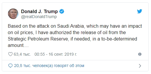 "В связи с нападением на Саудовскую Аравию, которое может оказать влияние на цены на нефть, я санкционировал выпуск нефти из стратегического нефтяного резерва, если это потребуется, в объеме достаточном, чтобы держать рынки хорошо снабженными", - написал президент США в твиттере.