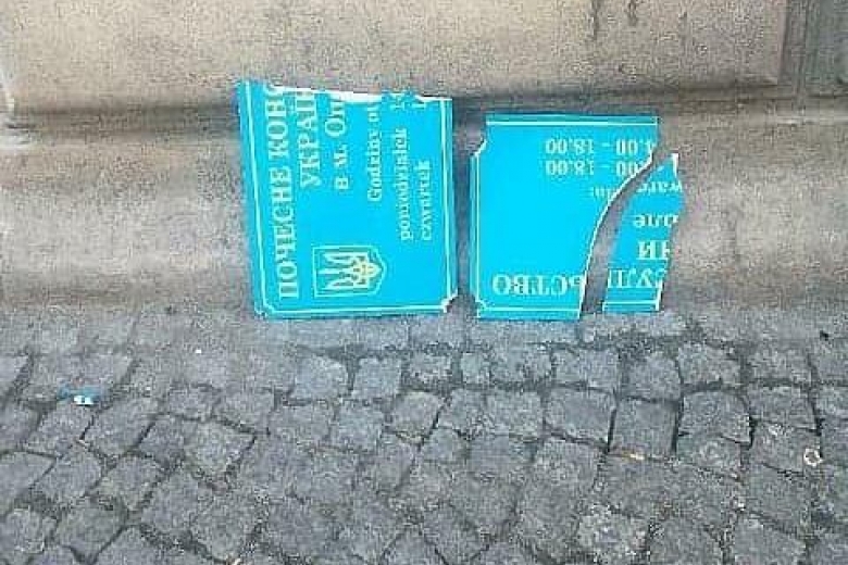 Случай произошел еще весной этого года в центре Ополя. Утром на тротуаре прохожие заметили уничтоженную вывеску из искусственного материала с гербом Украины, которая ранее висела на стене здания, где находятся офисы консульства.