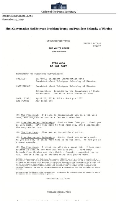 Телефонный разговор состоялся 21 апреля после победы Зеленского на президентских выборах, за два месяца до телефонного звонка 25 июля, который находится в центре расследования по импичменту Трампа.