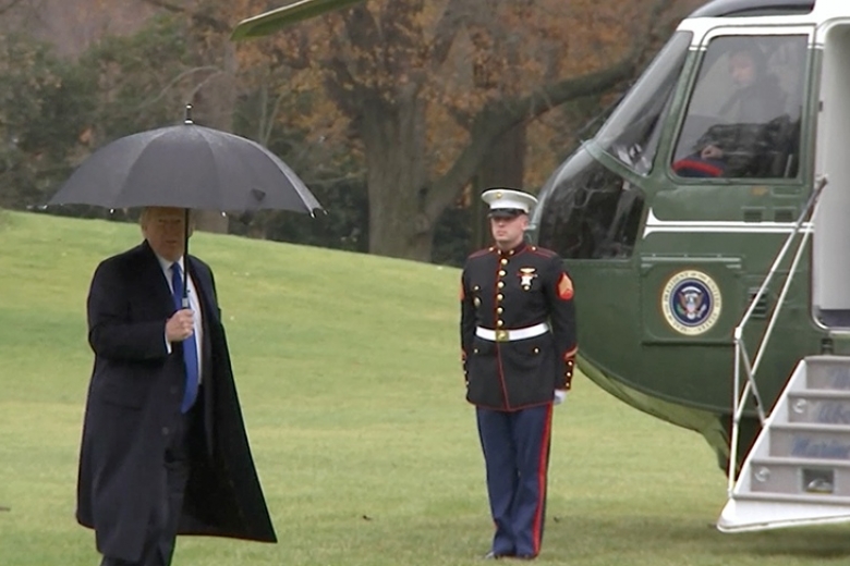 В Сеть попало видео, на котором президент США Дональд Трамп отправился к трапу самолета без супруги Мелании. Он держал над собой зонт и шел к трапу вертолета. Через некоторое время он решил остановиться и дождаться супруги, которая шла на каблуках.