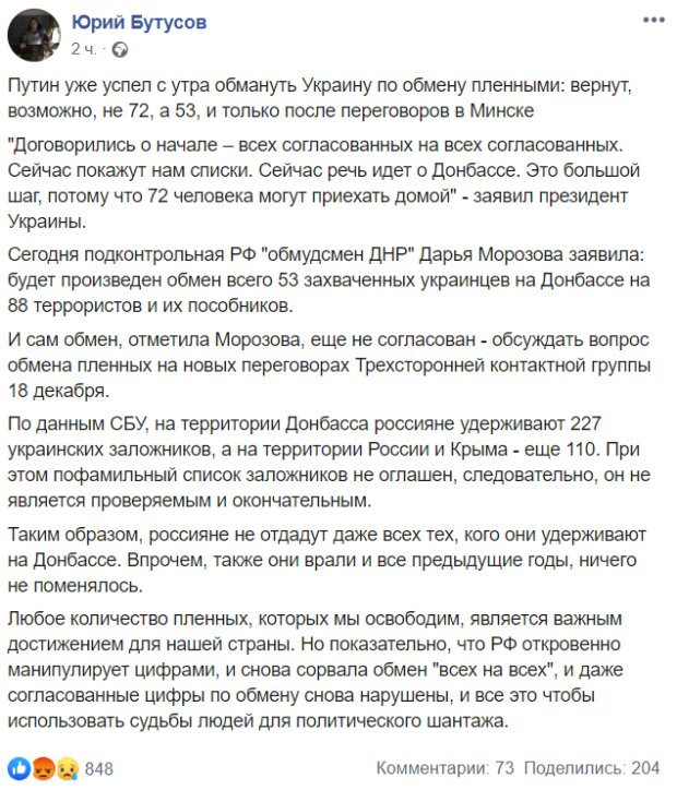 "Путин уже успел с утра обмануть Украину по обмену пленными: вернут, возможно, не 72, а 53, и только после переговоров в Минске", – отметил Бутусов.