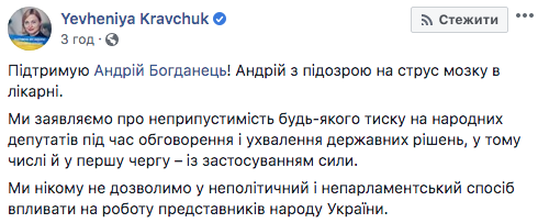 "Мы никому не позволим неполитическим и непарламентским способом влиять на работу представителей народа Украины", - написала Кравчук