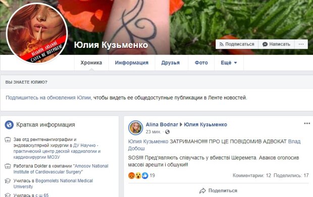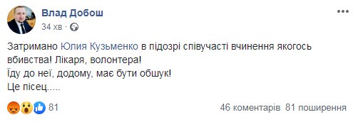 Более того, стали всплывать и другие имена подозреваемых. Оперуполномоченные задержали известного военного медика и волонтера Юлию Кузьменко. Об этом в Facebook написал адвокат Влад Добош. По его словам, женщине инкриминируют "умышленное убийство".