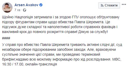 «Это итог очень сложной и упорной работы настоящих специалистов и важный шаг к полному раскрытию дела! Спасибо за службу!» - написал министр внутренних дел.