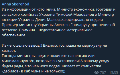 "Из чего делаю вывод! Видимо, господам на марихуану не хватает. Господа министры - идите, поживите на пенсию или минимальную з/п, которые вы установили! А вашему уходу будем рады, а то немного подташнивает от количества "дебилов" в Кабмине и не только!" - отметила Скороход.