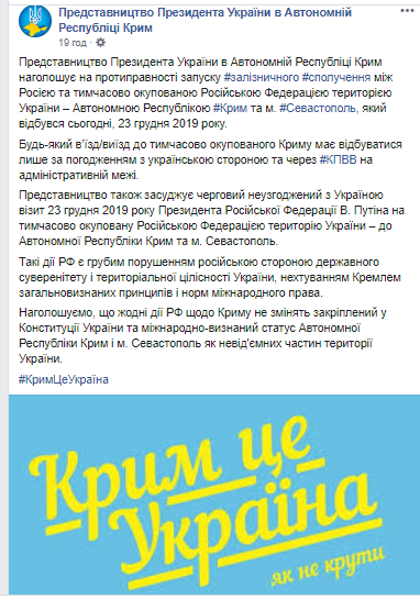 Противоправность запуска железнодорожного сообщения между Россией и временно оккупированным Крымом отмечает представительство президента Украины Владимира Зеленского, а также осуждает очередной несогласованный с Украиной визит российского президента Владимира Путина 23 декабря 2019 года на полуостров.