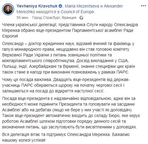 Об этом написала на своей странице в Facebook член делегации Евгения Кравчук.