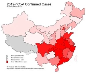 Семь провинций, две автономные области и все четыре муниципалитета Хубэй, Аньхой, Тяньцзинь, Пекин, Шанхай, Чунцин, Сычуань, Цзянси, Юньнань, Шаньдун, Фуцзянь, Гуанси, и Хэбэй объявили чрезвычайную ситуацию общественного здравоохранения 1-го уровня в хронологическом порядке. Город Цзинчжоу был помещен на карантин, в результате чего число людей в помещениях, находящихся на карантине, достигло 35 миллионов. Вся провинция Хубэй теперь попала под карантин по городам, за исключением лесного района Шеннонцзя.