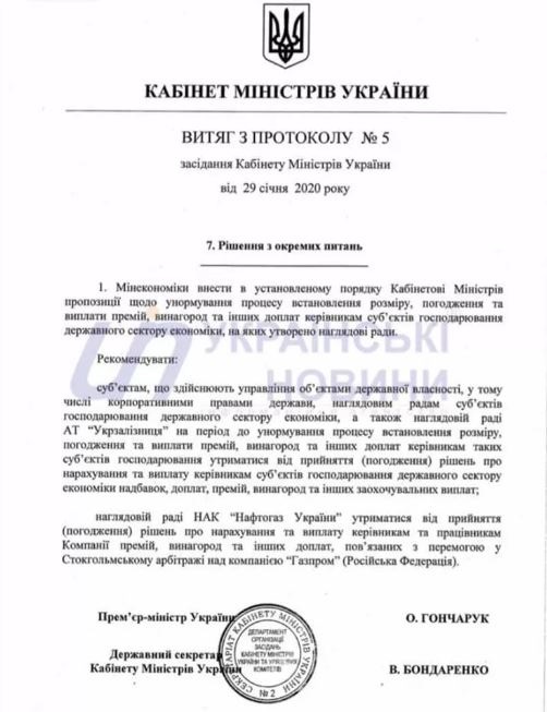 "Наблюдательному совету НАК Нафтогаз Украины воздержаться от принятия (согласования) решений о начислении и выплате руководителям и работникам компании премий, вознаграждений и других выплат, связанных с победой в Стокгольмском арбитраже над компанией Газпром", - говорится в документе.