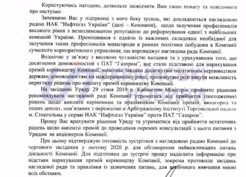 Также премьер Алексей Гончарук направил письмо к главе набсовета Нафтогаза Клэр Споттисвуд, в котором просит рассмотреть возможность пересмотра размера премий руководству компании, отдавая должное важности процедуре премирования в привлечении высокопрофессиональных специалистов.