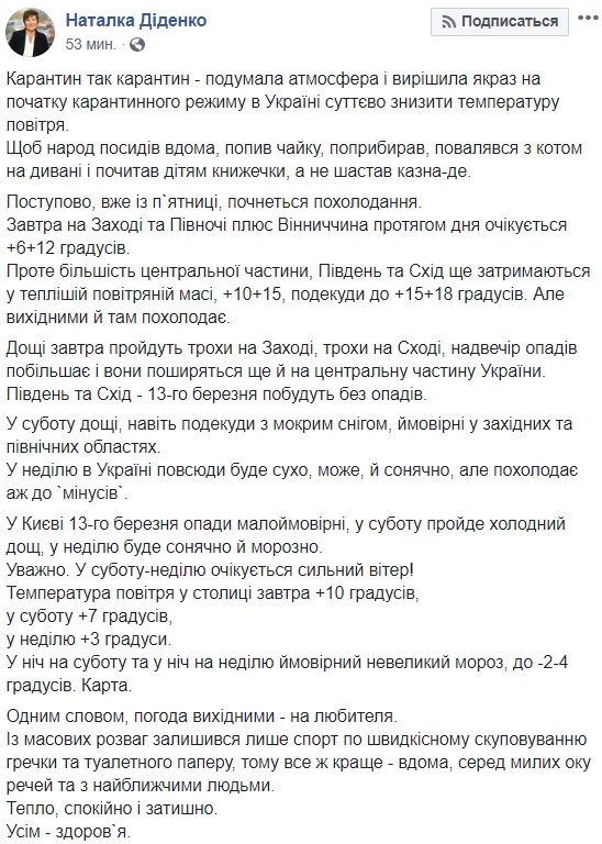 Синоптик Наталья Диденко предупредила украинцев о похолодании, которое придет в Украину уже в пятницу, 13 марта.