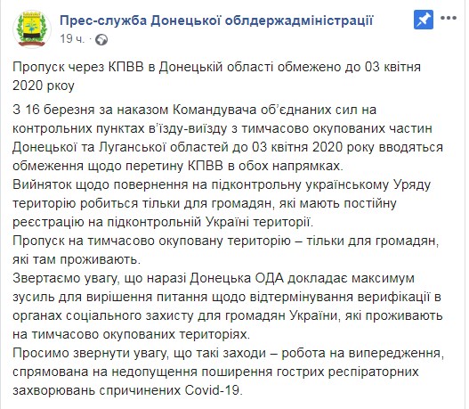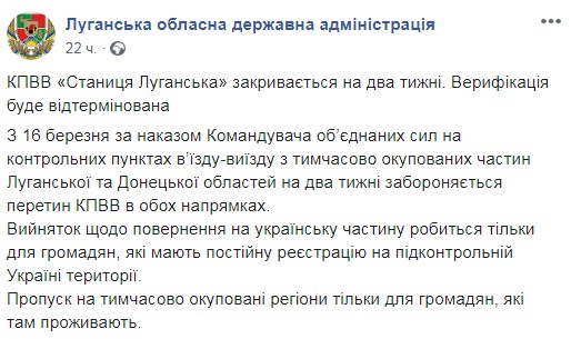 "КПВВ в Донецкой области приостанавливают работу до 3 апреля, единственный пункт пропуска в Луганской области ("Станица Луганская") - на две недели", – говорится в сообщениях.