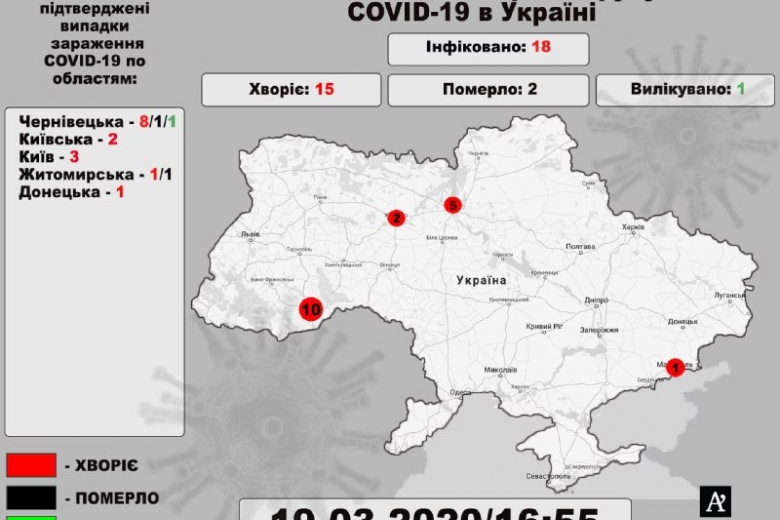 Сейчас в Украине зафиксировано 18 случаев инфицирования коронавирусом COVID-19, два из них - летальные.